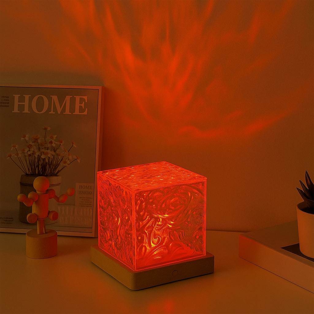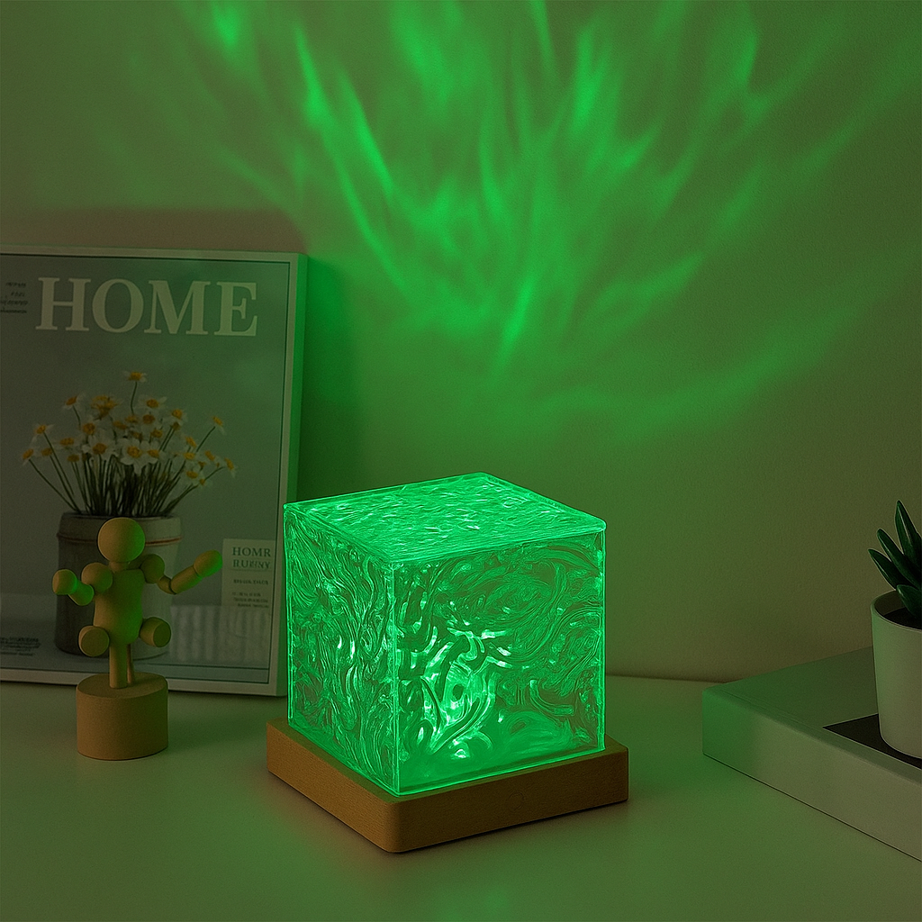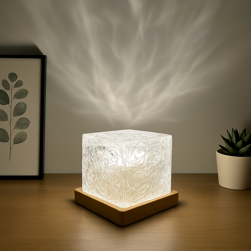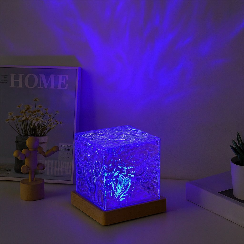 Designed with a sleek cubic structure, this elegant ambience lamp projects soothing water wave patterns that gently rotate, creating a serene and elevated environment.